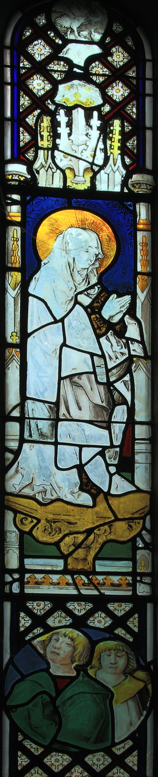 A large standing female Saint dressed in white on a Corinthian column. Above her is a stork with three eggs from one of which the chick is emerging.