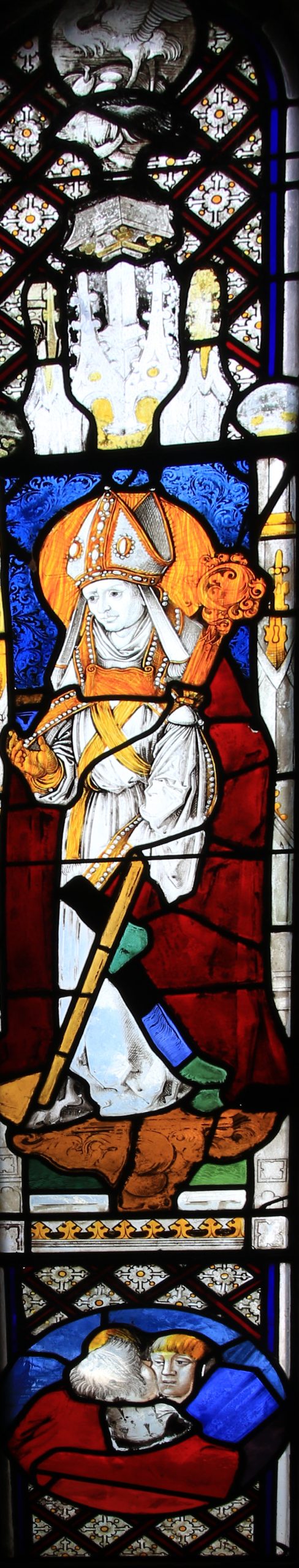 St. Exuperantius a patron St. of Zurich the brother of St. Regulla (see also window 7c) Holding his bearded head in both hands with blood spurting out of his neck.