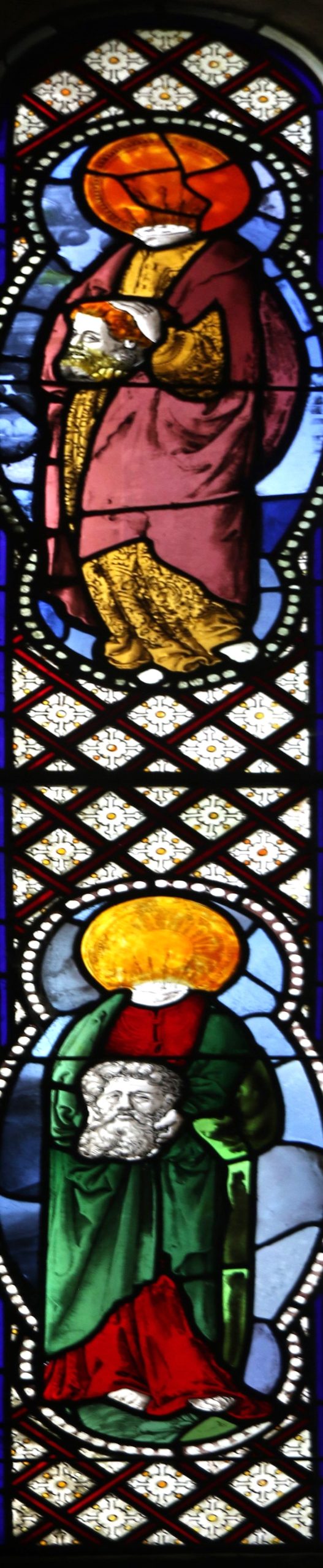 St. Felix a patron saint of Zurich. Holding his bearded head wearing a green cloak over a ruby vestment, blood also spurts from his neck. (see also window 7c)